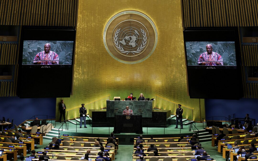 O presidente de Gana, John Dramani Mahama, discursa na Assembleia Geral da ONU durante sessão para votação de resolução que considera o tráfico de escravizados africanos como o pior crime da humanidade, em 25 de março de 2026.