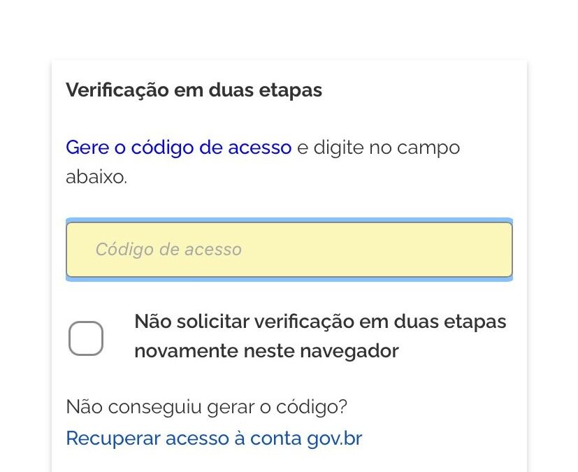 Na tela em que o sistema pede o código da verificação em duas etapas, clique em “Recuperar acesso à conta gov.br”.